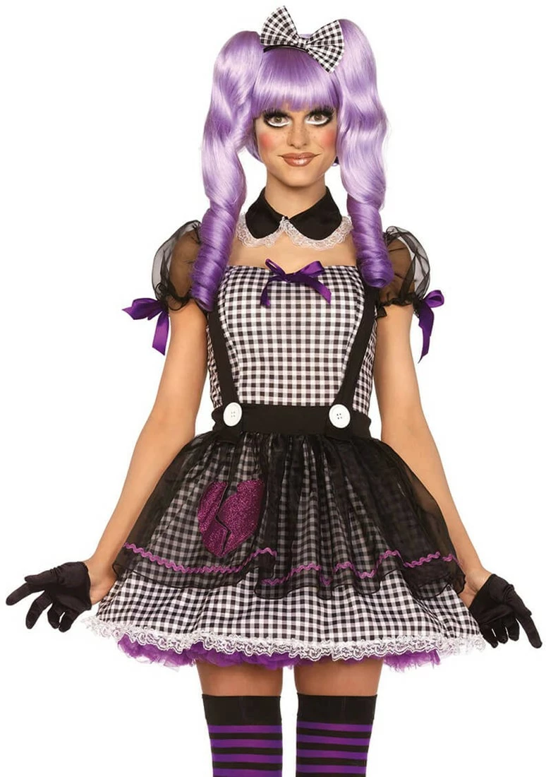 Details: babydoll jurkje met schort en glitter harten detail, een kraag met een kanten rand en een haarband met strik
