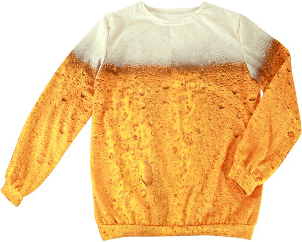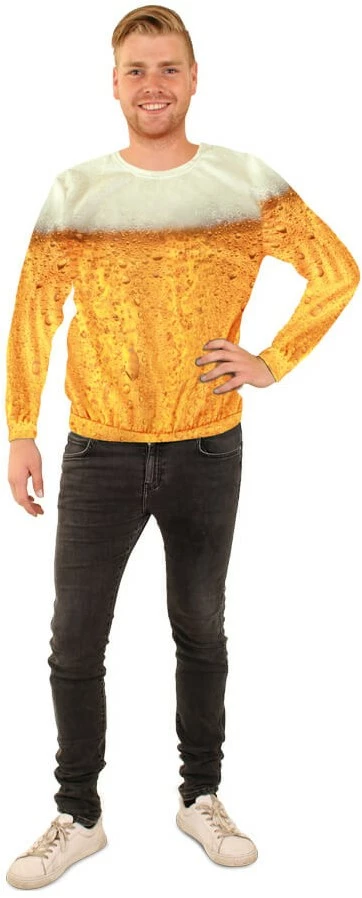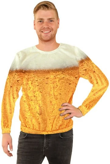 Bier, bier en nog meer bier! Met deze overgoten met een bier-print trui is het feest op elke party. Het shirt is gemaakt van 100% bier. Geintje natuurlijk, 100% polyester.