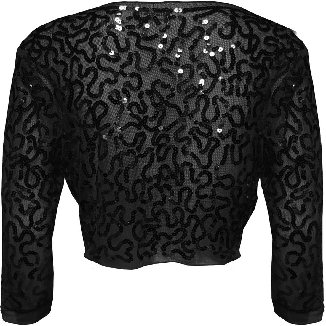 Een mooie zwarte bolero met zwarte pailletten. De bolero sluit aan de voorkant doormiddel van een klein haakje. Ook verkrijgbaar in andere kleuren.