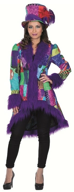 Deze jas met verschillende dierenvacht patronen in vrolijke kleuren, zorgt ervoor dat jij wel op valt tussen de feestvierders! De paarse afwerking van bont geeft deze jas een luxe look.