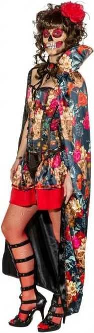 Mooie rok die zeer geschikt is voor het thema dag van de doden! De rok is gemaakt van 70% polyester en 30% polyurethaan. De rok bestaat uit een bloemenprint met schedels, rood onderrokje en een lederlook riem. De netpanty en pruik zijn apart verkrijgbaar. Let op: de rok wordt exclusief korset en cape geleverd.