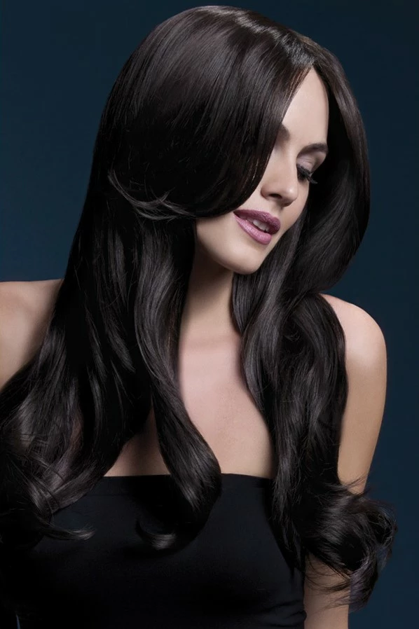 Een lange bruine pruik met laagjes en mooie krullen. De pruik is circa 66 centimeter lang en in meerdere kleuren verkrijgbaar. Deze prachtige pruik maakt deel uit van de Fever Wig Collection. Dit is een collectie met kwalitatieve en realistische pruiken.