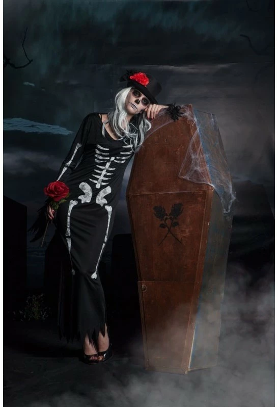 Een lange zwarte dames jurk met een opdruk van een wit geraamte. Een erg leuke jurk voor een halloweenfeest!