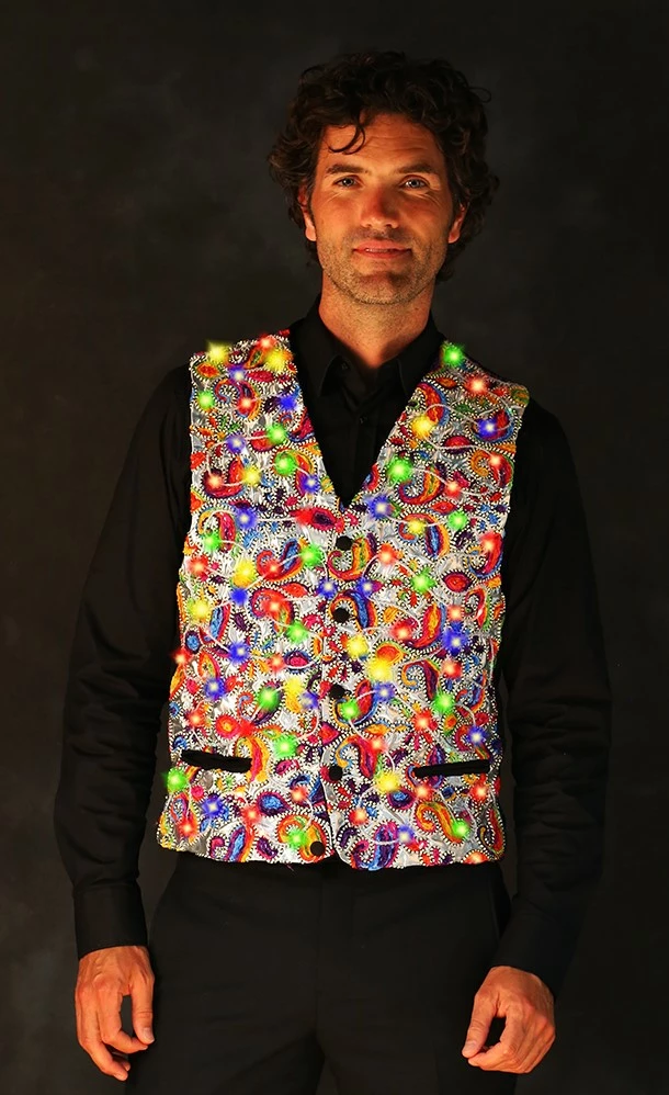Een gekleurd gilet met allemaal zilveren details en verlichting: een echte aanrader voor een carnavalsoutfit.