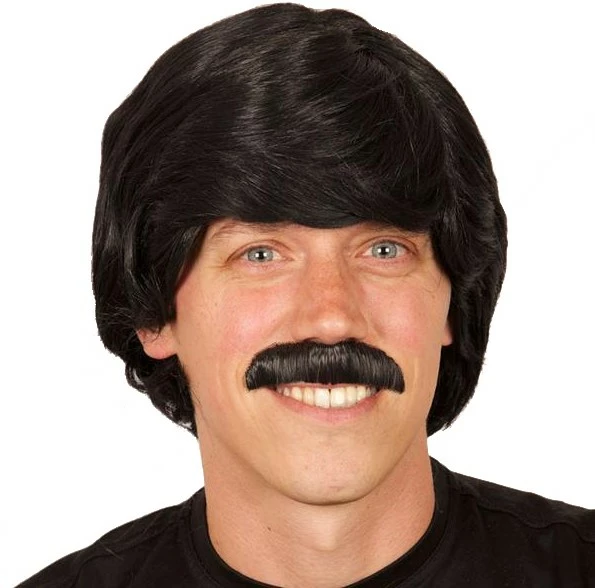 Zwarte herenpruik met een bijpassende snor.