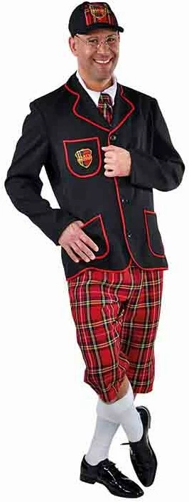 Schoolboy-kostuum met een geruit patroon. Dit kostuum bestaat uit een clobert, hemd, broek en bijpassende pet.