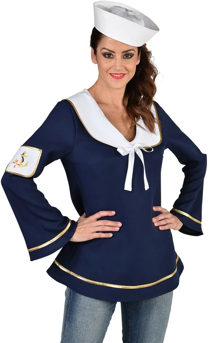 Details: grote witte kraag die op de borst samen komt in een strik. De mouwen en onderkant blouse zijn afgezet met goud band
