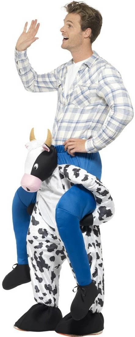 Dit hilarische kostuum doet het net lijken alsof je wordt gedragen door een koe! ???? Dit kostuum bestaat uit één geheel en is dus alleen het onderstuk. Het kostuum bestaat dus uit de koe en de over de schouders hangende blauwe (gevulde) broek.
