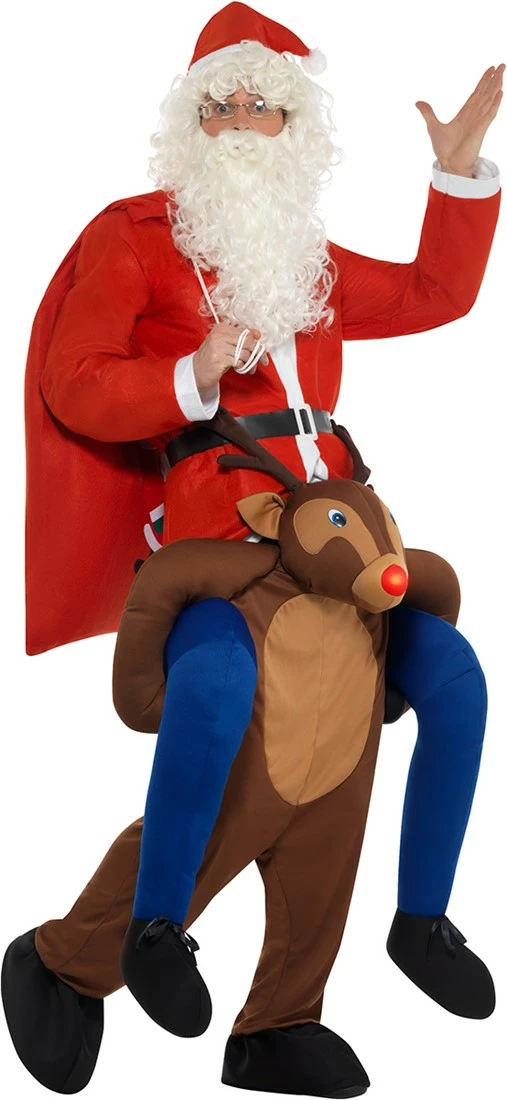 Dit grappige kostuum doet het net lijken alsof je wordt gedragen door een rendier! Dit kostuum bestaat uit één geheel en is dus alleen het onderstuk. Het kostuum bestaat dus uit het rendier en de over de schouders hangende blauwe (gevulde) broek.