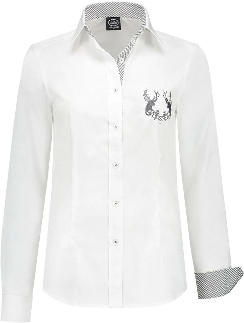 Een erg luxe trachtenblouse voor dames. De witte blouse met grijze details is perfect om boven een mooie lederhose aan te trekken naar een Oktoberfest.