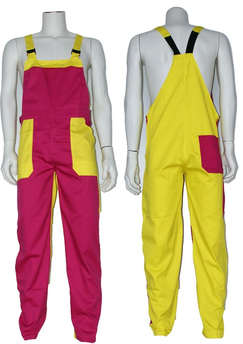 Tuinbroek Pink-Geel (65% katoen, 35% polyester).